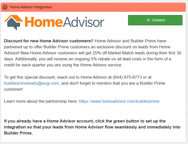To integrate with Angi/HomeAdvisor, navigate to Admin > Integrations > Lead Generators > Home Advisor and click the "+ Connect" button.