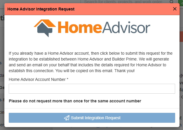 Enter your Angi account number into the Home Advisor integration page and submit the request.