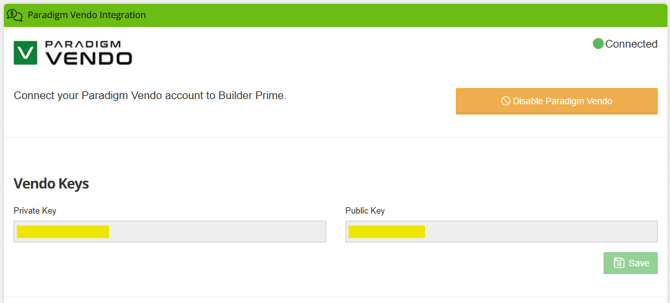 Click the button to connect and input the Private Key and Public Key from Vendo. The Private and Public keys in Vendo can be found within the admin panel under Advanced Settings > Public API.