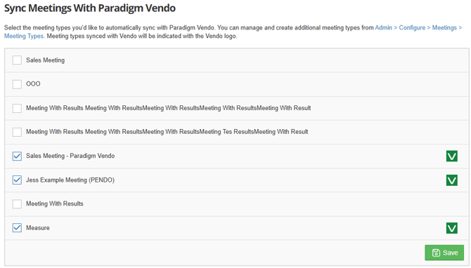 After the integration is connected, including the webhook configuration, select the meeting types to sync to Vendo by checking the box next to the meeting type and pressing the save button.