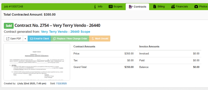4. Complete the remainder of the workflow within Builder Prime, including creating invoices, collecting payments, scheduling, and managing the project. Switching to the Scopes tab will allow you to assign labor and material per usual, and the Billing tab will pull invoice amounts from the sold amount within the contract.